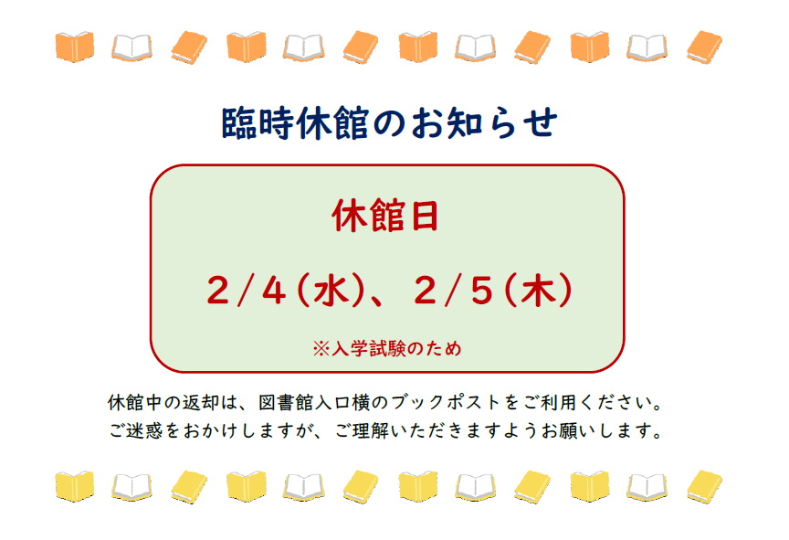2月4日(水)と2月5日(木)は、臨時休館いたします。