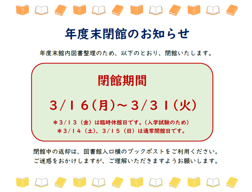 年度末図書整理のため、以下のとおり、閉館いたします。